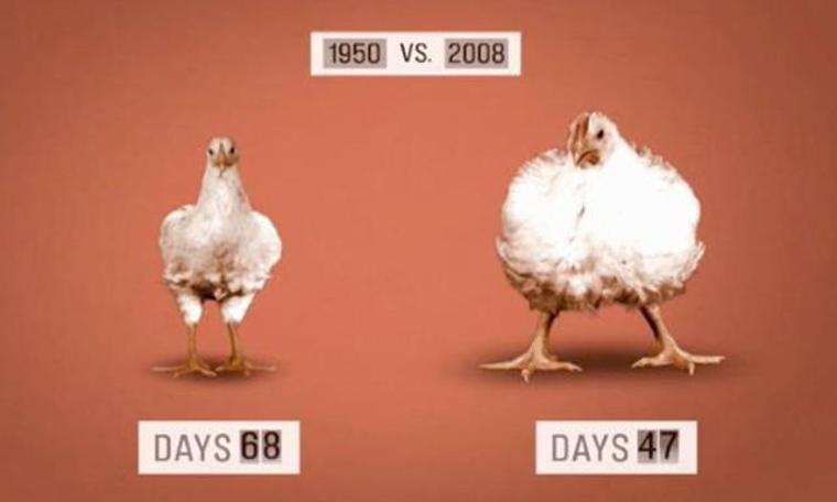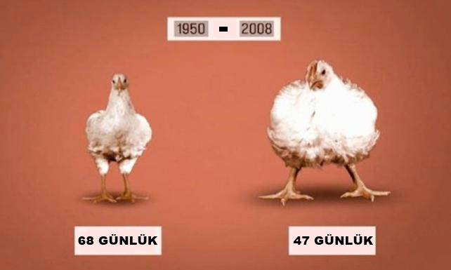 1950’li yıllarda daha iri tavuklar yetiştirmek için “geleceğin-tavuğu-programı” adı verilen bir proje başlatıldı. O tarihten sonra eti için beslenen tavuk radikal bir değişim geçirdi ve sonuçta kütlesi atalarına oranla 5 misli arttı. Tavuklar şimdi entegre üretim tesislerinde sıcaklığı, nemi ve ışığı kontrollü ortamlarda üretiliyor, 5-7 haftalık olunca kesimhaneye gönderiliyor. Kaldı ki daha uzun yaşamalarına izin verildiğinde, kısa sürede ölüyorlar, zira bacak ve göğüs kas dokusundaki aşırı büyüme, kalp ve akciğer gibi iç organlarının gelişmesine engel oluyor. Ayrıca bu türün insan müdahalesi olmadan yaşaması imkânsız.