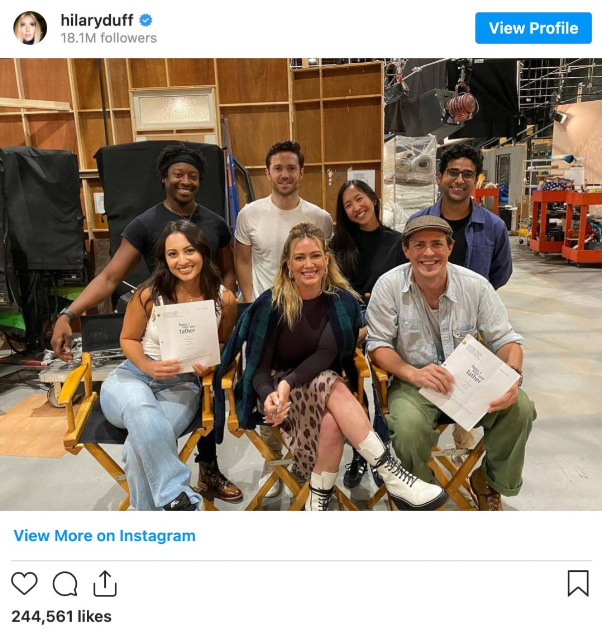 How I Met Your Father'ın paylaşılan görselinde Hilary Duff'ın yanı sıra Tom Ainsley, Tien Tran, Suraj Sharma, Chris Lowell, Francia Raisa yer alıyor. Duff paylaşımda, "Kimler bizim için hazır? Birinin dairesinin önünde oturuyor olabiliriz ya da olmayabiliriz…" ifadelerini kullandı.