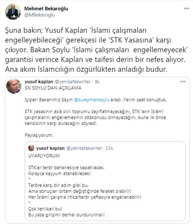 Söz konusu açıklamalara tepki CHP İstanbul Milletvekili Mehmet Bekaroğlu'ndan geldi. Kapnaln'ın açıklamalarını paylaşan Bekaroğlu, "Şuna bakın; Yusuf Kaplan 'İslami çalışmaları engelleyebileceği' gerekçesi ile 'STK Yasasına' karşı çıkıyor. Bakan Soylu 'İslami çalışmaları engellemeyecek' garantisi verince Kaplan ve taifesi derin bir nefes alıyor. Ana akım islamcılığın özgürlükten anladığı budur" dedi.ifadeleri yer aldı.