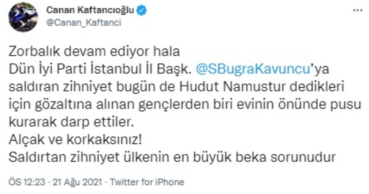 Saldırıya muhalefetten sert tepki geldi. Sosyal medya hesabından tepki gösteren CHP İstanbul İl Başkanı Canan Kaftancıoğlu, "Zorbalık devam ediyor hala. Dün İyi Parti İstanbul İl Başkanı Buğra Kavuncu’ya saldıran zihniyet bugün de Hudut Namustur dedikleri için gözaltına alınan gençlerden biri evinin önünde pusu kurarak darp ettiler. Alçak ve korkaksınız! Saldırtan zihniyet ülkenin en büyük beka sorunudur" ifadelerini kullandı.
