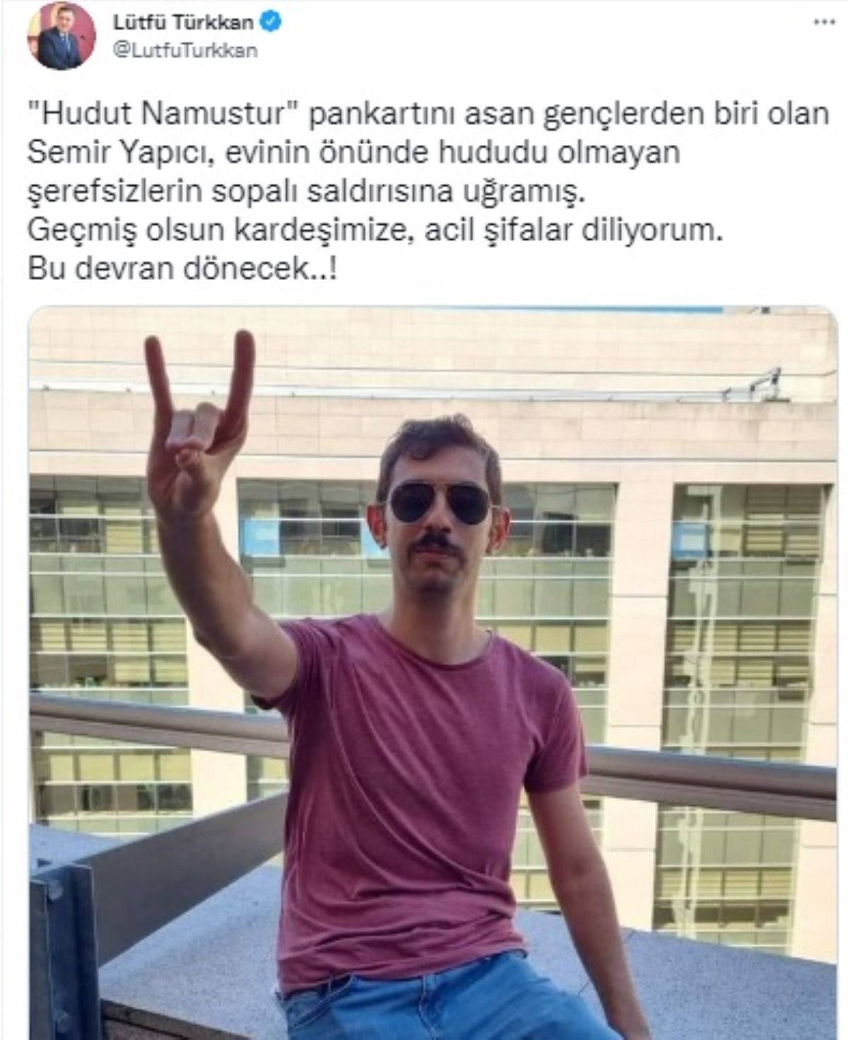 İYİ Parti Grup Başkan Vekili ve Kocaeli Milletvekili Lütfü Türkkan da "'Hudut Namustur' pankartını asan gençlerden biri olan Semir Yapıcı, evinin önünde hududu olmayan şerefsizlerin sopalı saldırısına uğramış. Geçmiş olsun kardeşimize, acil şifalar diliyorum. Bu devran dönecek.." dedi.