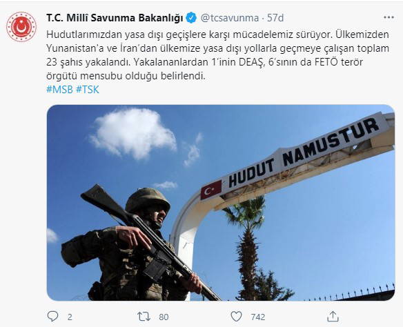 Milli Savunma Bakanlığının Twitter hesabından yapılan açıklamada, hudutlardan yasa dışı geçişlere karşı mücadelenin sürdüğü belirtildi.
