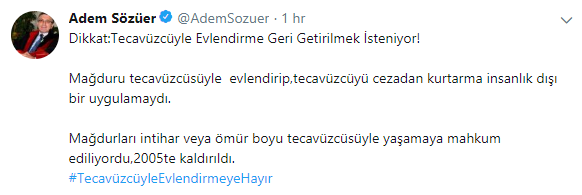 Sözüer, sosyal medya hesabından kritik bir uyarıda bulundu. Prof. Sözüer, “Mağduru ömür boyu tecavüzcüsüyle yaşamaya mahkûm eden uygulamanın 2005’te kaldırıldığını” hatırlatarak “Dikkat: Tecavüzcüyle evlendirme geri getirilmek isteniyor!” diye yazdı.