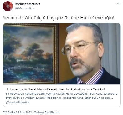 AKP'li Mehmet Metiner de Cevizoğlu'na bu sözleri nedeniyle sosyal medya hesabı üzerinden "Senin gibi Atatürkçü baş göz üstüne Hulki Cevizoğlu!" diyerek seslendi.