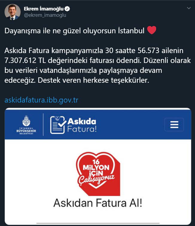 Ödenen faturaların düzenli olarak duyuracağını söyleyen Başkan İmamoğlu, "Dayanışma ile ne güzel oluyorsun İstanbul. Askıda Fatura kampanyamızla 30 saatte 56.573 ailenin 7.307.612 TL değerindeki faturası ödendi. Düzenli olarak bu verileri vatandaşlarımızla paylaşmaya devam edeceğiz. Destek veren herkese teşekkürler." dedi.