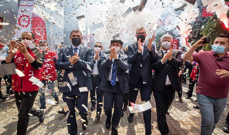 İzmir Büyükşehir Belediyesi şirketi İZELMAN ile DİSK Genel-İş Sendikası arasında uzlaşma ile sonuçlanan toplu iş sözleşmesinin imza töreni, erken 1 Mayıs kutlamasına sahne oldu. 7 bin personeli ilgilendiren ve tüm taban ücretlere yüzde 21 oranında zam öngören sözleşmenin imza töreninde işçiler, Büyükşehir Belediye Başkanı Tunç Soyer’e sevgi gösterilerinde bulundu.