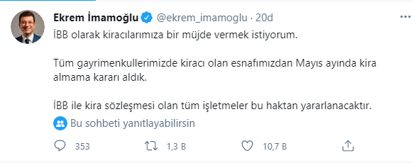 Öte yandan, İBB Başkanı İmamoğlu, Twitter hesabından şu bilgileri paylaştı: