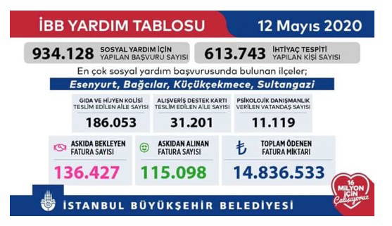 Murat Ongun Twitter hesabından “İstanbul’da kimseyi geride bırakmıyor, yüz binlerce ihtiyaç sahibine ulaşıyoruz. İBB’nin sosyal yardım faaliyetlerini size düzenli verilerle iletmeye devam edeceğiz. 23 Nisan için 100 bin ve Anneler Günü için 9 bin koli olmak üzere İBB sosyal yardım tablosu şu şekildedir:” diyerek tabloyu paylaştı.