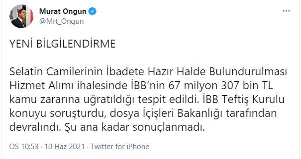 Ongun, sosyal medya hesabından 'Yeni bilgilendirme' diyerek duyurduğu gelişmeye ilişkin, "Selatin Camilerinin İbadete Hazır Halde Bulundurulması Hizmet Alımı ihalesinde İBB’nin 67 milyon 307 bin TL kamu zararına uğratıldığı tespit edildi" ifadelerini kullandı.