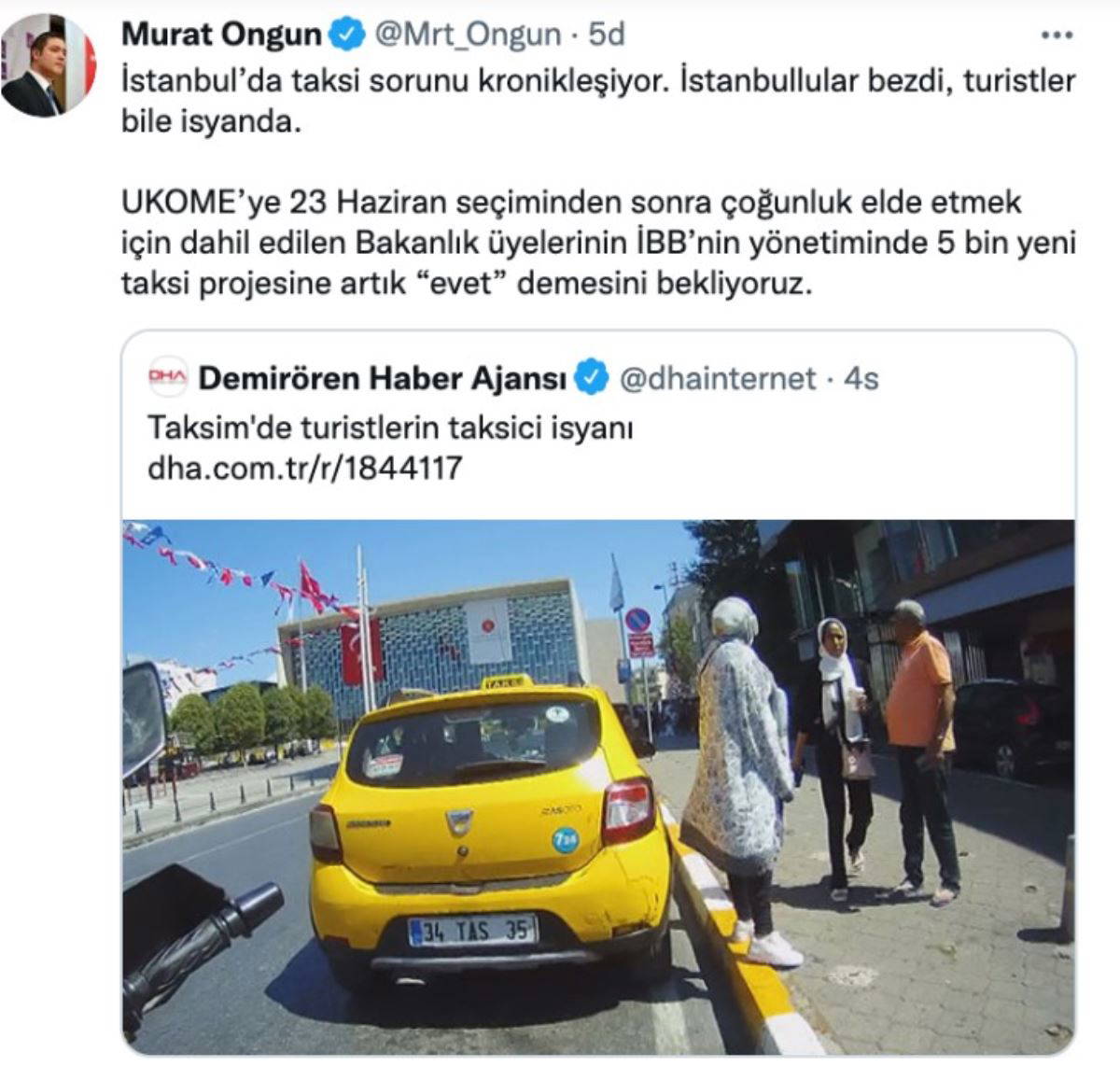 İBB Sözcüsü Murat Ongun, Twitter hesabından yaptığı paylaşımda "Bakanlık üyelerinin İBB’nin yönetiminde 5 bin yeni taksi projesine artık 'evet' demesini bekliyoruz" ifadelerini kullandı.