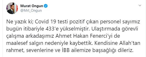 " Ne yazık ki; Covid 19 testi pozitif çıkan personel sayımız bugün itibariyle 433'e yükselmiştir. Ulaştırmada görevli çalışma arkadaşımız Ahmet Hakan Fenerci’yi de maalesef salgın nedeniyle kaybettik. Kendisine Allah'tan rahmet, sevenlerine ve İBB ailemize başsağlığı dileriz."