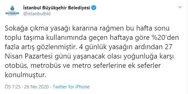 ''Sokağa çıkma yasağı kararına rağmen bu hafta sonu toplu taşıma kullanımında geçen haftaya göre %20'den fazla artış gözlenmiştir. 4 günlük yasağın ardından 27 Nisan Pazartesi günü yaşanacak olası yoğunluğa karşı otobüs, metrobüs ve metro seferlerine ek seferler konulmuştur.''