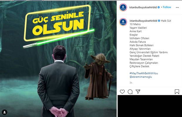 İBB Instagram hesabından yapılan paylaşımda 'Yıldız Savaşları' filminin "Güç seninle olsun" repliği paylaşıldı. Görselde filmin ikonik karakterlerinden Yoda ve İmamoğlu yer alıyor. İmamoğlu'nun görsele yerleştirilen fotoğrafı ise incelemeye konu olan türbe ziyaretinden. İmamoğlu, ellerini arkaya kavuşturmuş şekilde Yoda'nın karşısında dururken görülüyor.
