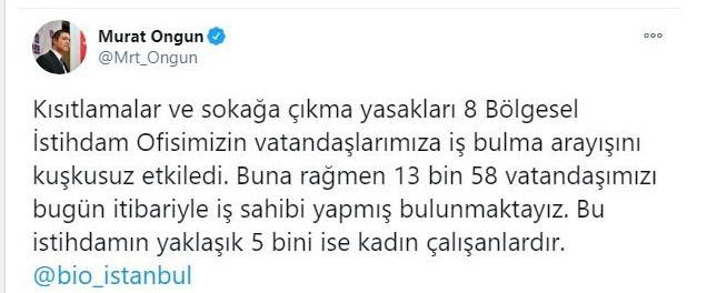 “Kısıtlamalar ve sokağa çıkma yasakları 8 Bölgesel İstihdam Ofisimizin vatandaşlarımıza iş bulma arayışını kuşkusuz etkiledi. Buna rağmen 13 bin 58 vatandaşımızı bugün itibariyle iş sahibi yapmış bulunmaktayız. Bu istihdamın yaklaşık 5 bini ise kadın çalışanlardır”