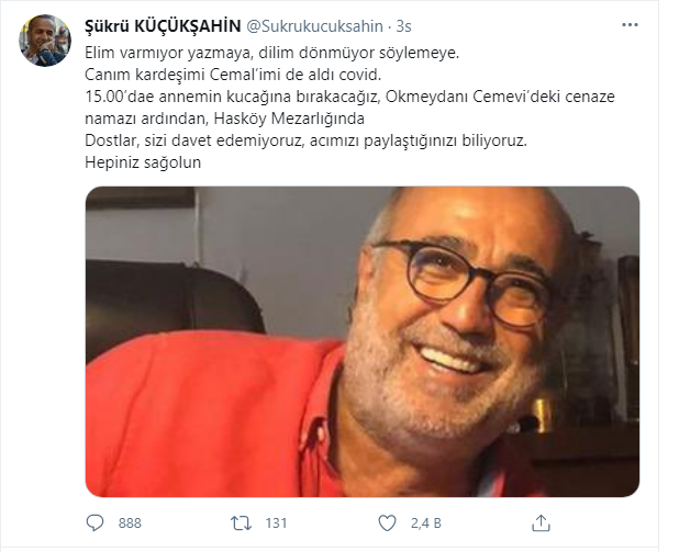 İstanbul Büyükşehir Belediyesi (İBB) Medya İlişkileri Koordinatörü gazeteci Şükrü Küçükşahin, sosyal medya hesabından yaptığı açıklamada kardeşi Cemal Küçükşahin'in Covid-19 nedeniyle yaşamını yitirdiğini açıkladı.