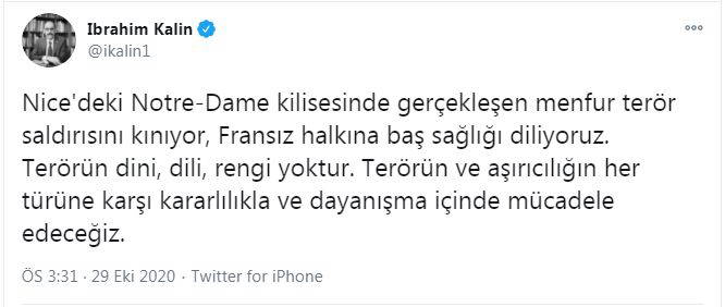Cumhurbaşkanlığı Sözcüsü Kalın, Twitter hesabından yaptığı açıklamada, "Nice'deki Notre-Dame Kilisesi'nde gerçekleşen menfur terör saldırısını kınıyor, Fransız halkına başsağlığı diliyoruz. Terörün dini, dili, rengi yoktur. Terörün ve aşırıcılığın her türüne karşı kararlılıkla ve dayanışma içinde mücadele edeceğiz" dedi.