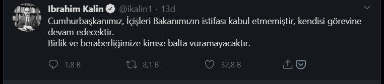 Kalın kendi sosyal medya hesabından yaptığı açıklamada, "Cumhurbaşkanımız, İçişleri Bakanımızın istifası kabul etmemiştir, kendisi görevine devam edecektir. Birlik ve beraberliğimize kimse balta vuramayacaktır" dedi.