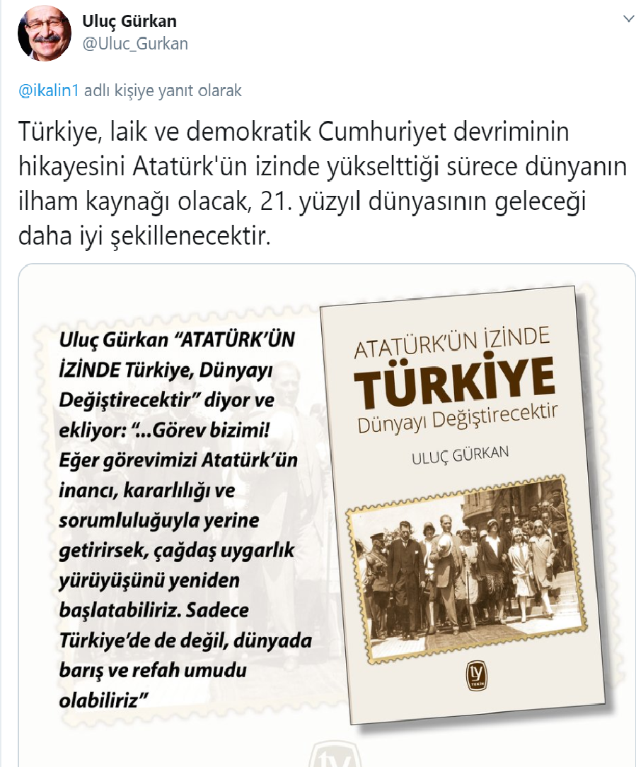 “Türkiye, laik ve demokratik Cumhuriyet devriminin hikayesini Atatürk'ün izinde yükselttiği sürece dünyanın ilham kaynağı olacak, 21. yüzyıl dünyasının geleceği daha iyi şekillenecektir” notunu düşerek “Atatürk’ün İzinde Türkiye Dünyayı değiştirecektir” kitabının görselini paylaştı.