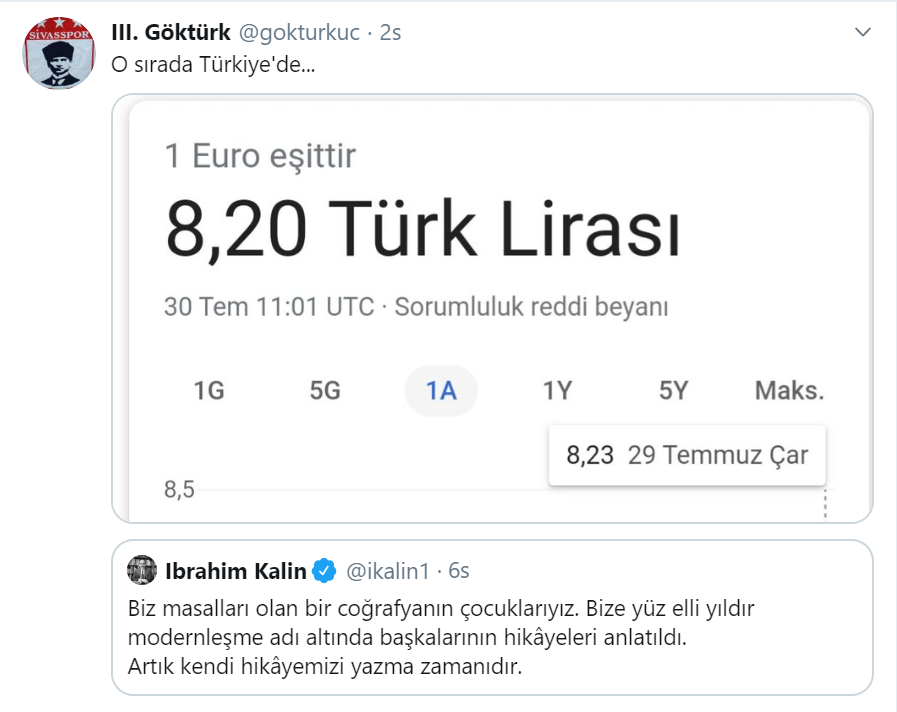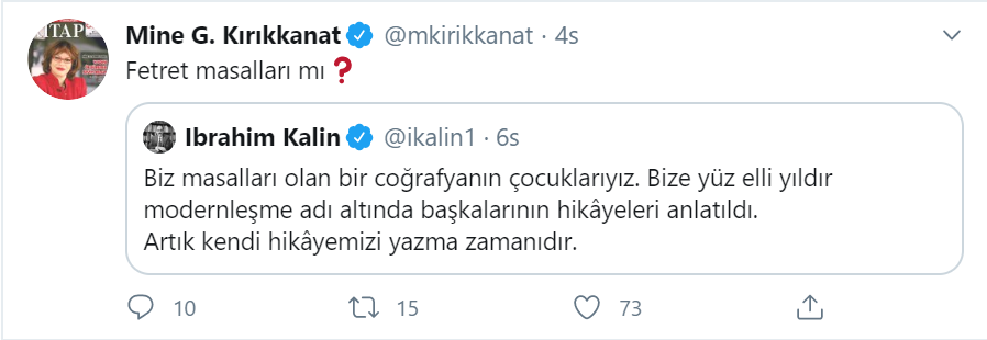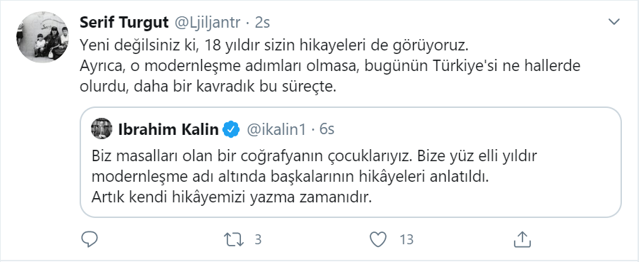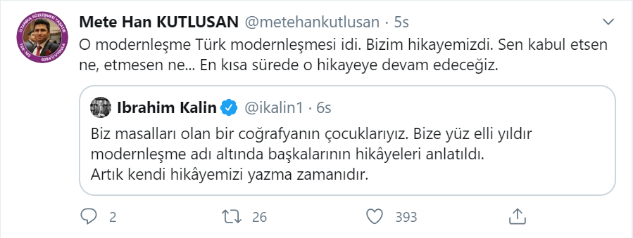 Cumhurbaşkanlığı sözcüsü İbrahim Kalın, sosyal medya hesabından "Bize yüz elli yıldır modernleşme adı altında başkalarının hikâyeleri anlatıldı. Artık kendi hikâyemizi yazma zamanıdır" paylaşımı yapınca siyasiler ve yurttaşlar Kalın’ın tweet'ini alıntılayarak tepkilerini gösterdi.