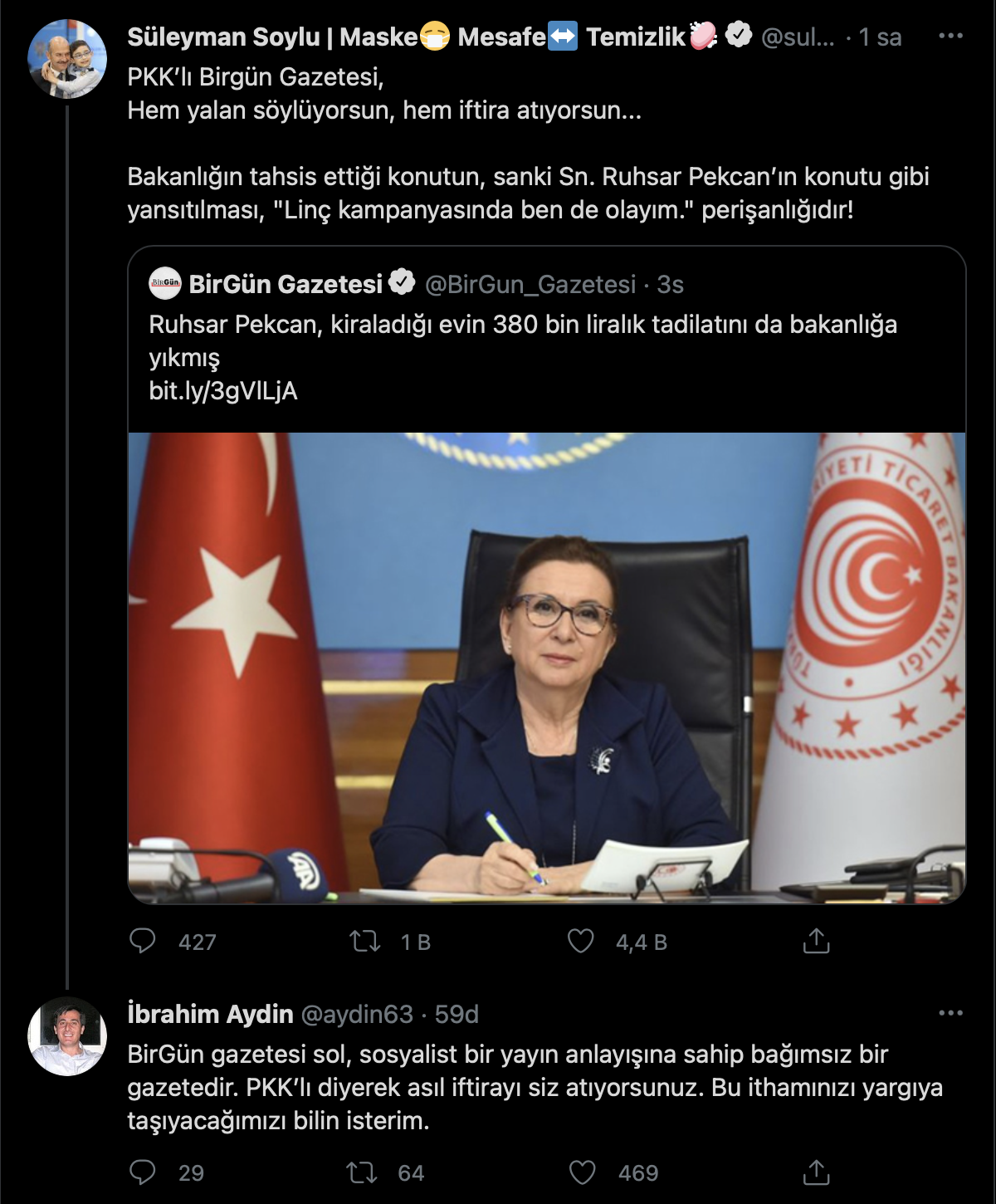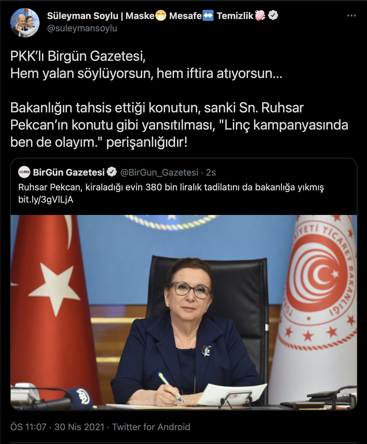 Twitter hesabı üzerinden BirGün'ün haberine tepki gösteren içişleri Bakanı Süleyman Soylu; "PKK’lı Birgün Gazetesi, hem yalan söylüyorsun, hem iftira atıyorsun... Bakanlığın tahsis ettiği konutun, sanki Sn. Ruhsar Pekcan’ın konutu gibi yansıtılması, 'linç kampanyasında ben de olayım' perişanlığıdır!" ifadelerini kullandı.