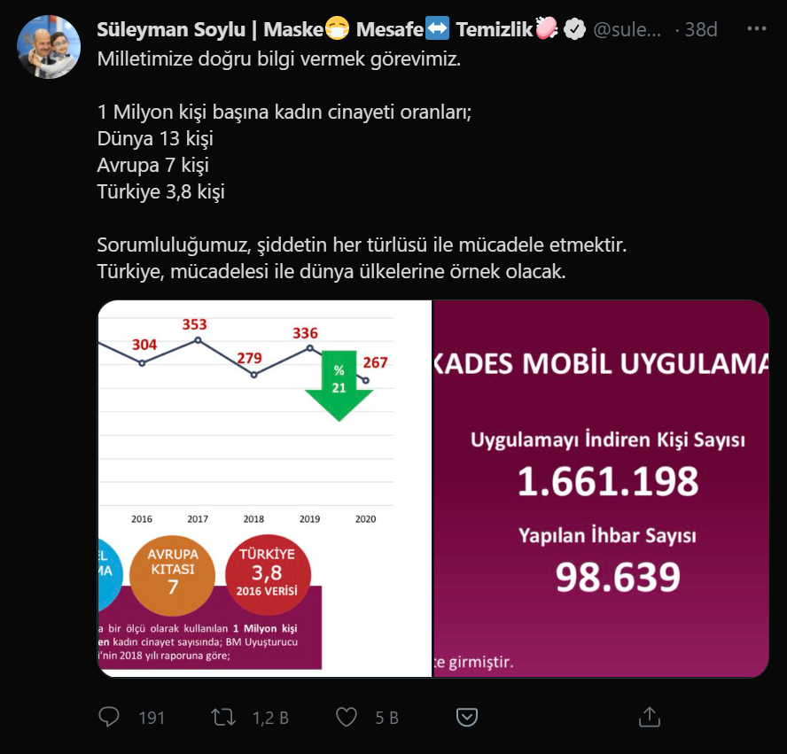 Soylu bugün de sosyal hesabından Türkiye'de işlenen kadın cinayetleri oranlarını dünya ve Avrupa ile kıyasladı.