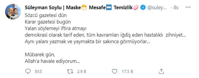 "Sözcü gazetesi dün Karar gazetesi bugün. Yalan söylemeyi iftira atmayı demokrasi olarak tarif eden, tüm kavramları iğdiş eden hastalıklı zihniyet... Aynı yalanı yazmak ve yaymakta bir sakınca görmüyorlar... Mübarek gün, Allah’a havale ediyorum..."