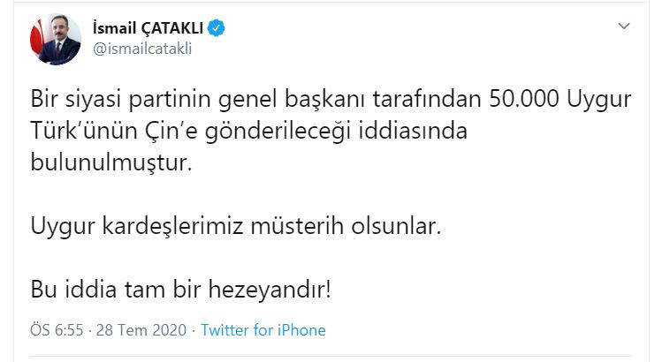 Bakanlık Sözcüsü Çataklı, sosyal medya hesabından yaptığı paylaşımda “Bir siyasi partinin genel başkanı tarafından 50.000 Uygur Türkünün Çin’e gönderileceği iddiasında bulunulmuştur. Uygur kardeşlerimiz müsterih olsunlar. Bu iddia tam bir hezeyandır” ifadelerini kullandı.