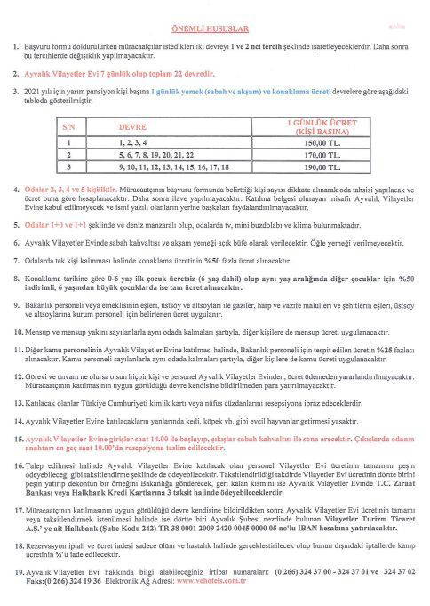 İçişleri Bakanlığı, kendi personeli ve diğer kamu personelinin konaklayabileceği Vilayetler Evi Ayvalık Otel için başvuruları açtı. Otelde İçişleri personeli kişi başı 150 lira ile 190 lira arasında değişen fiyatlarda konaklayabilecek, diğer kurum personellerinden ise yüzde 25 daha fazla para alınacak.