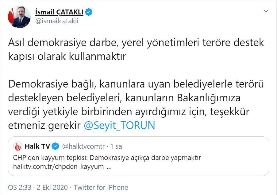 İçişleri Bakan Yardımcısı ve Bakanlık Sözcüsü İsmail Çataklı da Twitter hesabından, Torun'un eleştirisinin yer aldığı haberi paylaşıp, Torun'u etiketleyerek, şunları kaydetti: