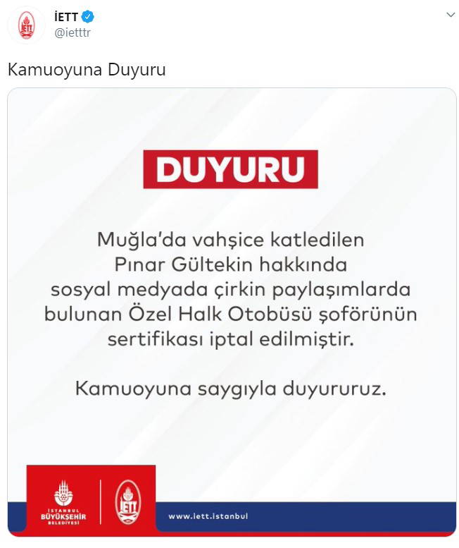 İETT resmi Twitter hesabından yaptığı açıklamada, Gültekin hakkında çirkin paylaşımlarda bulunan Emrah Koçyiğit'in Özel Halk Otobüsü şoförü olduğu açıkladı. İETT, Koçyiğit'in sertifikasının iptal edildiğini duyurdu.