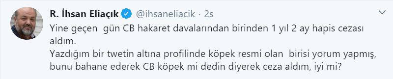 Eliaçık, "Yine geçen gün Cumhurbaşkanına hakaret davalarından birinden 1 yıl 2 ay hapis cezası aldım. Yazdığım bir twetin altına profilinde köpek resmi olan birisi yorum yapmış, bunu bahane ederek Cumhurbaşkanına köpek mi dedin diyerek ceza aldım, iyi mi?" ifadelerini kullandı.