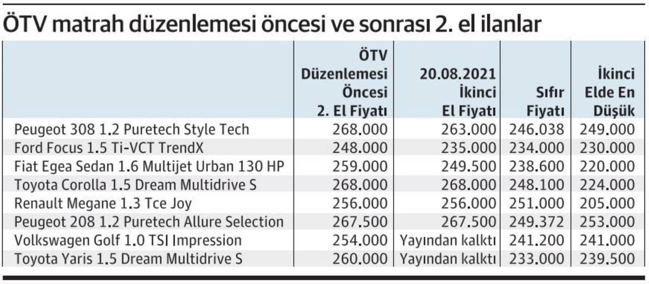 Dünya gazetesinden Barış Erkaya'nın haberine göre, ÖTV düzenlemesinin çıktığı gün, henüz markalar fiyatlarını açıklamamışken favoriler listesine alınan en çok satanlardan 8 araç modelinin fiyat seyrini hafta boyunca takip edildi. Bu takip aslında ikinci el piyasada üç ayrı satıcı tipinin olduğunu gösterdi.