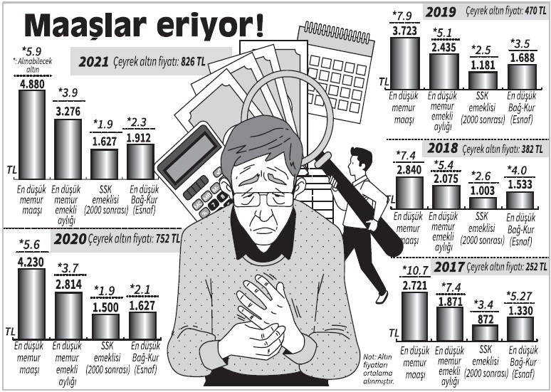 Türkiye’de memur emeklisinin zammı toplusözleşmeye göre 2 yılda bir tespit ediliyor. Son 6 aylık enflasyon, belirlenen rakamları aşarsa fark yansıtılıyor. SGK ve Bağ-Kur emeklisine yapılacak zamlar ise doğrudan enflasyona endeksli. 6 ayda gerçekleşen enflasyon kadar zam yapılıyor. İşte bu nedenle iktidarın maaş zammında geçmiş 6 aylık enfasyona mahkûm ettiği işçi ve Bağ-Kur emeklisi bu yıl da perişan. Maaşlar asgari ücret bir yana açlık sınırının bile altında kaldı.