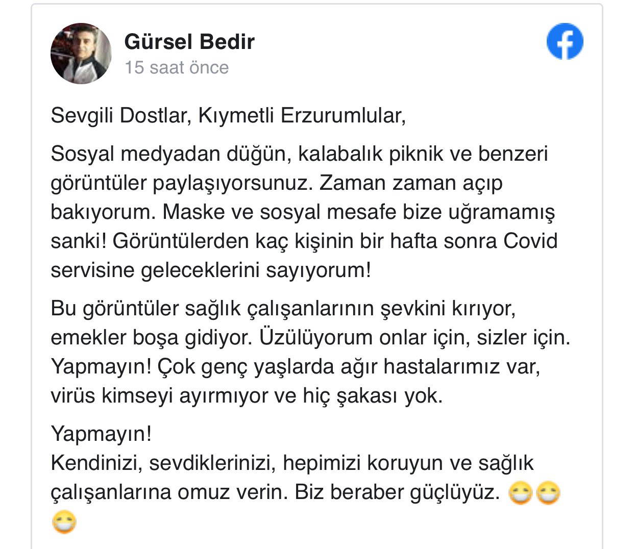 "Maske ve sosyal mesafe bize hiç uğramamış sanki! Görüntülerden kaç kişinin bir hafta sonra Kovid servisine geleceklerini sayıyorum! Bu görüntüler sağlık çalışanlarının şevkini kırıyor, emekler boşa gidiyor. Üzülüyorum onlar için, sizler için. Yapmayın! Çok genç yaşlarda ağır hastalarımız var, virüs kimseyi ayırmıyor ve hiç şakası yok. Yapmayın! Kendinizi, sevdiklerinizi, hepimizi koruyun ve sağlık çalışanlarına omuz verin. Biz beraber güçlüyüz."