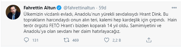 İletişim Başkanı Fahrettin Altun, gazeteci Hrant Dink'in öldürülüşünün 14. yıl dönümünde ''Ülkemizin vicdanlı evladı, Anadolu’nun yürekli sevdalısıydı Hrant Dink. Bu toprakların harcındaydı onun alın teri, kalemi hep kardeşlik için çırpındı. Hain terör örgütü FETÖ Hrant’ı bizden koparalı 14 yıl oldu. Samimiyetini ve Anadolu’ya olan sevdanı her daim hatırlayacağız'' açıklamasını yaptı.