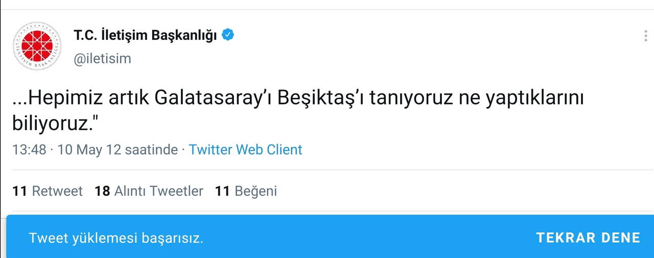 Öte yandan Türkiye Cumhuriyeti İletişim Başkanlığı'nın resmi Twitter hesabından atılan "... Hepimiz artık Galatasaray'ı Beşiktaş'ı tanıyoruz ne yaptıklarını biliyoruz" tweeti de kısa sürede silindi.