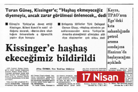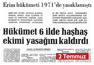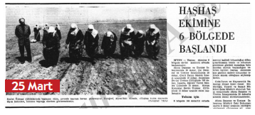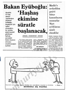 25 Mart tarihli haberimizde, devlet üretme çiftliklerinde başlayan haşhaş ekiminin fotoğraflı haberi var. 17 Nisan tarihli haberimizde Turan Güneş, Kissinger’a “Haşaş ekmeyeceğiz diyemeyiz, ancak zarar görülmesi önlenecek” dedi. 11 Mayıs tarihli haberimizde Güneş: “Haşhaş yasağını sürdürmek için ABD’den yardım almak bir çeşit dilenciliktir” diyor. 2 Temmuz tarihli haber kupürümüzde ise haşhaş ekimi yasağının kaldırıldığının haberi veriliyor. 6 Temmuz tarihli haberimize göre ise Amerika, “Haşhaş için istişare” gerekçesiyle büyükelçisini geri çağırıyor. Ecevit, kararın demokratik ülkeler halklarınca anlayışla karşılanacağını söylüyor. BM’den bir uzmanlar heyeti çağırıyor.
