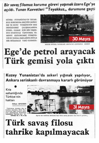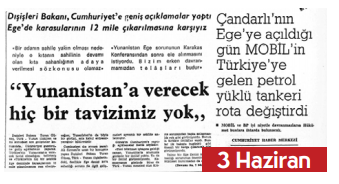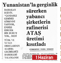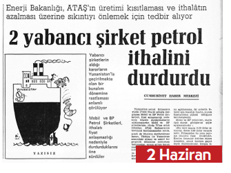 6 Haziran günlü haberimizde Ali Sirmen’in Ege’de kıta sahanlığı kavgası yazısı var. Altındaki haberde Çandarlı’nın yeniden Ege’ye açılacağı duyuruluyor. 8 Haziran günlü sayfamızda Türkiye’nin kıta sahanlığının Yunanistan yakınlarına kadar uzandığı açıklanıyor. Ümit Gürtuna’dan ayrıca Ege’de petrol aramayı AP iktidarının reddettiği özel haberi var. 18 Haziran günlü haberimizde ise Yılmaz Gümüşbaş imzasıyla, hükümetin ATAŞ’ın 270 günlük yasal sürenin sonunda devletleştirileceğini, iki şirkete resmen bildirdiği duyuruluyor. 14 Haziran günlü haberde BP şirketi bugünün fiyatlarıyla ikmal yapamayacağını bayilerine duyuruyor. 15 Haziran günlü haberimizde Mobil de yakıt ikmalini kesiyor, halkın ve sanayinin ihtiyacı devletçe karşılanıyor. 16 Haziran günlü kupürümüzde, Çandarlı için yeni bir nota var. 18 Haziran günlü haberimizde Mobil ve BP’nin hükümetin istediği şartları kabul ettiklerinin haberi var. ATAŞ’ın bir gün sonra eski fiyatlarla üretime devam edeceği duyuruluyor.