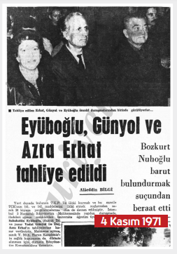 Sizinle paylaşacağım 4 Kasım 1971 tarihli Cumhuriyet’in birinci sayfasında yayımlanmış bu fotoğraflı haber kupürünün, rahatça okunabilen başlıkları ve paylaşılmış fotoğrafından da kolayca anlaşılacağı üzere, Eyüboğlu, Günyol ve Azra Erhat’ın tahliye edilişlerinin gecesinden alıntı. Aslında Harun Karadeniz’in kansere yakalandığı biline biline tedavisinin engellenmesi kasıtlı, gelişmelerin özetlendiği 11 Aralık tarihli sayfaya sığdıramadığımız haber kupürlerinin içinde kalmıştı. Üç ünlü aydınımızın tahliyesine karar verilen duruşmada mahkeme ayrıca, sanık Y. Müh. Harun Karadeniz’in sağlık hususunun da dikkate alınması için, durumu sıkıyönetim komutanlığına bildirme kararını da vermişti. Karadeniz’e ayrılmış geçen haftanın sayfasında özeti yapılmış gelişmelerden de görüleceği üzere, Harun Karadeniz’in tedavi için Londra’ya gitmesine izin verilen tarih 24 Aralık 1973 olarak kayda geçiyor. Sayısız bilimsel rapor ve başvurulara karşın, iki yılı aşan bir gecikme ile kolunu kesmek zorunda kalan doktorları “Altı ay önce neden gelmediniz?” sorgulamasını yapıyor. Harun, artık kurtuluşunun olmadığını bile bile ülkesine geri dönmeyi seçiyor, kesik kolu ile de toplumsal savaşımdan vazgeçmeyerek toplumsal etkinliklere katılıyor, kitap çalışmalarını hızlandırıyor.. Ülkemizin Cumhuriyet sonrası gelişiminin tersyüz edilmesinde etkinliği hafife alınmış 12 Mart’ın, yaşamın her alanına dönük sol gösterip sağdan vurma sayısız operasyonları nedeniyle, İlhan Selçuk’un, 1 Şubat 1974 yılında Cumhuriyet’in ikinci sayfasında yayımlanmış, Sabahattin Eyüboğlu’nun cezaevi anılarından alınmış, tanıklığını paylaştığı gerçek fırıldakları üzerinden esinlenmiş yazısını, dönemin yaşanmışlıklarının mizah ustalığının örneği olarak sizinle paylaşmamak haksızlık olacaktı: