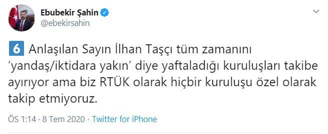 "Anlaşılan Sayın İlhan Taşçı tüm zamanını ‘yandaş/iktidara yakın’ diye yaftaladığı kuruluşları takibe ayırıyor ama biz RTÜK olarak hiçbir kuruluşu özel olarak takip etmiyoruz. Dileğim ve beklentim odur ki, bir siyasi partinin temsilcisi gibi değil de özünde bağımsızlık olan RTÜK Üyeliğinin gerektirdiği vakarla zihinlerimiz siyasetten arınmış olarak görevimizi yerine getirelim. Artık kanalları kategorize etmekten, ayrım yapmaktan lütfen vazgeçelim."
