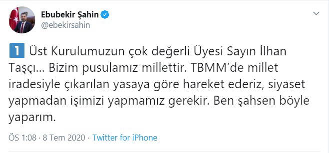 Şahin, Twitter hesabından yaptığı paylaşımla, Taşçı'nın "Ebubekir Şahin’in pusulası Saraydır" sözlerine şu yanıtı verdi: