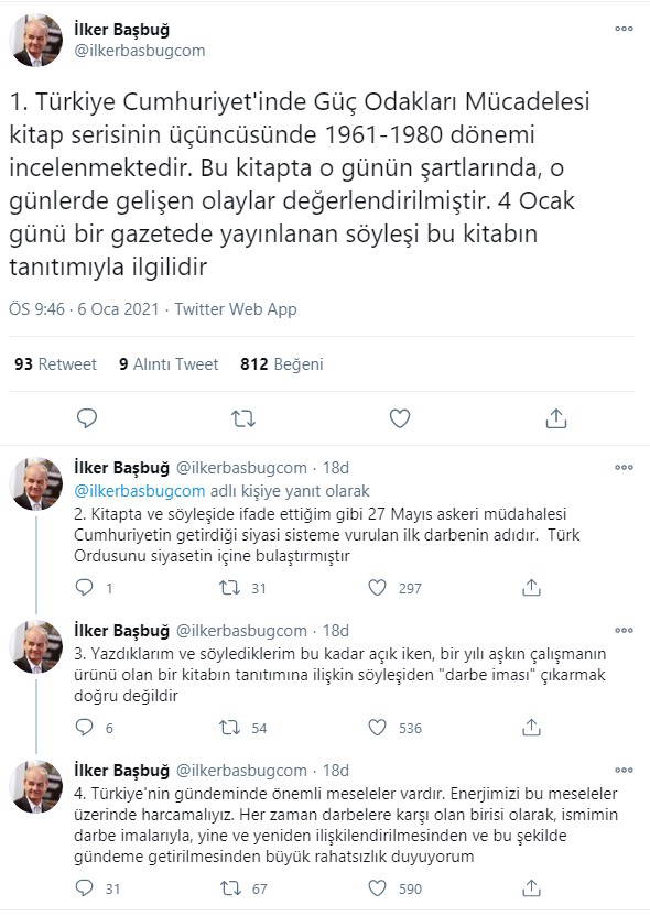 ''Türkiye Cumhuriyet'inde Güç Odakları Mücadelesi kitap serisinin üçüncüsünde 1961-1980 dönemi incelenmektedir. Bu kitapta o günün şartlarında, o günlerde gelişen olaylar değerlendirilmiştir. 4 Ocak günü bir gazetede yayınlanan söyleşi bu kitabın tanıtımıyla ilgilidir. Kitapta ve söyleşide ifade ettiğim gibi 27 Mayıs askeri müdahalesi Cumhuriyetin getirdiği siyasi sisteme vurulan ilk darbenin adıdır. Türk Ordusunu siyasetin içine bulaştırmıştır. Yazdıklarım ve söylediklerim bu kadar açık iken, bir yılı aşkın çalışmanın ürünü olan bir kitabın tanıtımına ilişkin söyleşiden "darbe iması" çıkarmak doğru değildir. Türkiye'nin gündeminde önemli meseleler vardır. Enerjimizi bu meseleler üzerinde harcamalıyız. Her zaman darbelere karşı olan birisi olarak, ismimin darbe imalarıyla, yine ve yeniden ilişkilendirilmesinden ve bu şekilde gündeme getirilmesinden büyük rahatsızlık duyuyorum.''