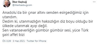 "Anadolu’da bir çınar altını senden esirgediğimiz için utandım. Dedim ki, utanmazlığın haksızlığın diz boyu olduğu bir ülkede utanmak ayıp değil. Sen vatanseverliğin gümbür gümbür sesi, yüce Türk şairi affet bizi"