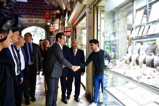 Dünyanın en eski çarşılarından birisi olan Kapalıçarşı'da programına başladığını ifade eden İmamoğlu, “Dünyanın en eski ve bütünlükçü bir çarşısı Kapalıçarşı. Tarihsel süreçte birçok yangın, deprem geçirmesine rağmen kendini korumuş ve bugünlere kadar gelmiş. Dolayısıyla, Osmanlı Dönemi'nde Fatih Sultan Mehmet döneminde başlatılan bu adım gerçekten çok yenilikçi ve uzun vadeli ve geleceği gören, miras şeklinde bize kalan inanılmaz kıymetli ve değerli bir alan. Bir sokağı bile Avrupa'da olsa ya da bir caddesi diyelim, biraz daha işi büyütelim, tahmin ediyorum dünyanın vitrininde dururdu. Tarih kokan ama aynı zamanda turizm merkezi, 500 binin üzerinde ziyaretçisi olan bir merkez ama bugünlerde neredeyse 4'te birine kadar düşme eğilimi de gösteren bir merkez. Tabi bu düşüş, sadece ziyaretçi sayısı ile değil, aynı zamanda para harcayan turistin de gelmemesi ile paralel, aslında sayıdan daha kötü para harcayan Avrupalı turistin Türkiye'yi tercih etmemesi daha doğrusu İstanbul'u tercih etmemesi daha da acı. Tarihi yarımadaya baktığımızda sadece Kapalıçarşı değil, diğer tarihi çarşılar ile beraber çevresinde konumlanmış ve buraya çok önemli beklentiler ile gelmiş girişimci insanlarımız da var" şeklinde konuştu.