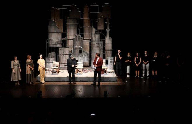 İBB Başkanı İmamoğlu, Şehir Tiyatroları Genel Sanat Yönetmeni Mehmet Ergen’in daveti üzerine sahneye çıkarak oyunculara çiçek verdi.