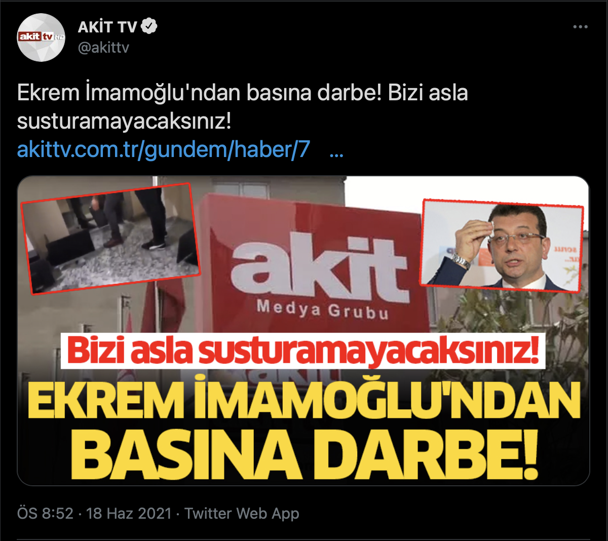 AKİT TV, yaşananları “İmamoğlu Haciz Baskınıyla Akit TV’yi Susturmak İstedi” başlığıyla haberleştirdi.