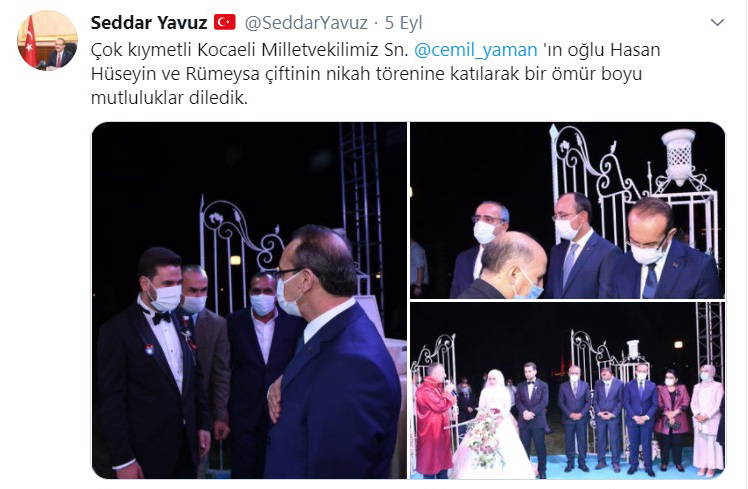 AKP Kocaeli Milletvekili Cemil Yaman'ın oğlu Hüseyin Yaman'ın koronavirüs tedbirlerine uyulmaması nedeniyle eleştirilen düğün törenine Kocaeli Valisi Seddar Yavuz’un da katıldığı öğrenildi.