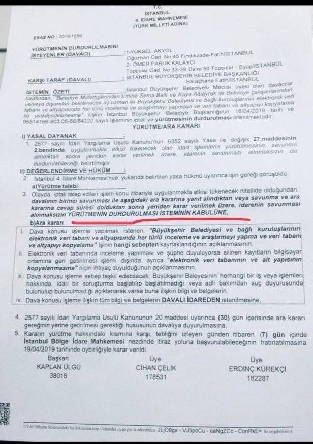 AKP’li meclis üyeleri Yüksel Akyol ve Ömer Faruk Kalaycı, İmamoğlu’nun kopyalama talimatıyla ilgili olarak idare mahkemesine başvurdu. Başvuruyu değerlendiren İstanbul 4. İdare Mahkemesi, İmamoğlu’nun “tüm verilerin kopyalanması” emrinin yürütmesini durdurdu.