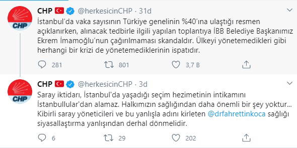 "İstanbul’da vaka sayısının Türkiye genelinin %40’ına ulaştığı resmen açıklanırken, alınacak tedbirle ilgili yapılan toplantıya İBB Belediye Başkanımız Ekrem İmamoğlu’nun çağırılmaması skandaldır. Ülkeyi yönetemedikleri gibi herhangi bir krizi de yönetemediklerinin ispatıdır. Saray iktidarı, İstanbul'da yaşadığı seçim hezimetinin intikamını İstanbullular'dan alamaz. Halkımızın sağlığından daha önemli bir şey yoktur... Kibirli saray yöneticileri ve bu yanlışla adını kirleten @drfahrettinkoca sağlığı siyasallaştırma yanlışından derhal dönmelidir."
