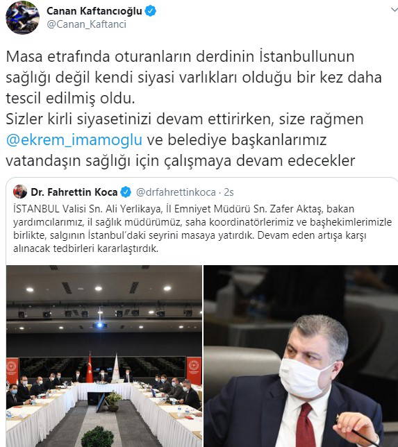 Konuya ilişkin Kaftancıoğlu ise, "Masa etrafında oturanların derdinin İstanbullunun sağlığı değil kendi siyasi varlıkları olduğu bir kez daha tescil edilmiş oldu. Sizler kirli siyasetinizi devam ettirirken, size rağmen @ekrem_imamoglu ve belediye başkanlarımız vatandaşın sağlığı için çalışmaya devam edecekler" dedi.